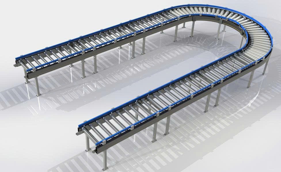 "Dây chuyền Băng tải Con lăn hoặc Hệ thống Băng tải Con lăn. Cụm từ này ám chỉ một chuỗi các đoạn băng tải con lăn được kết nối lại với nhau để tạo thành một tuyến đường vận chuyển dài.