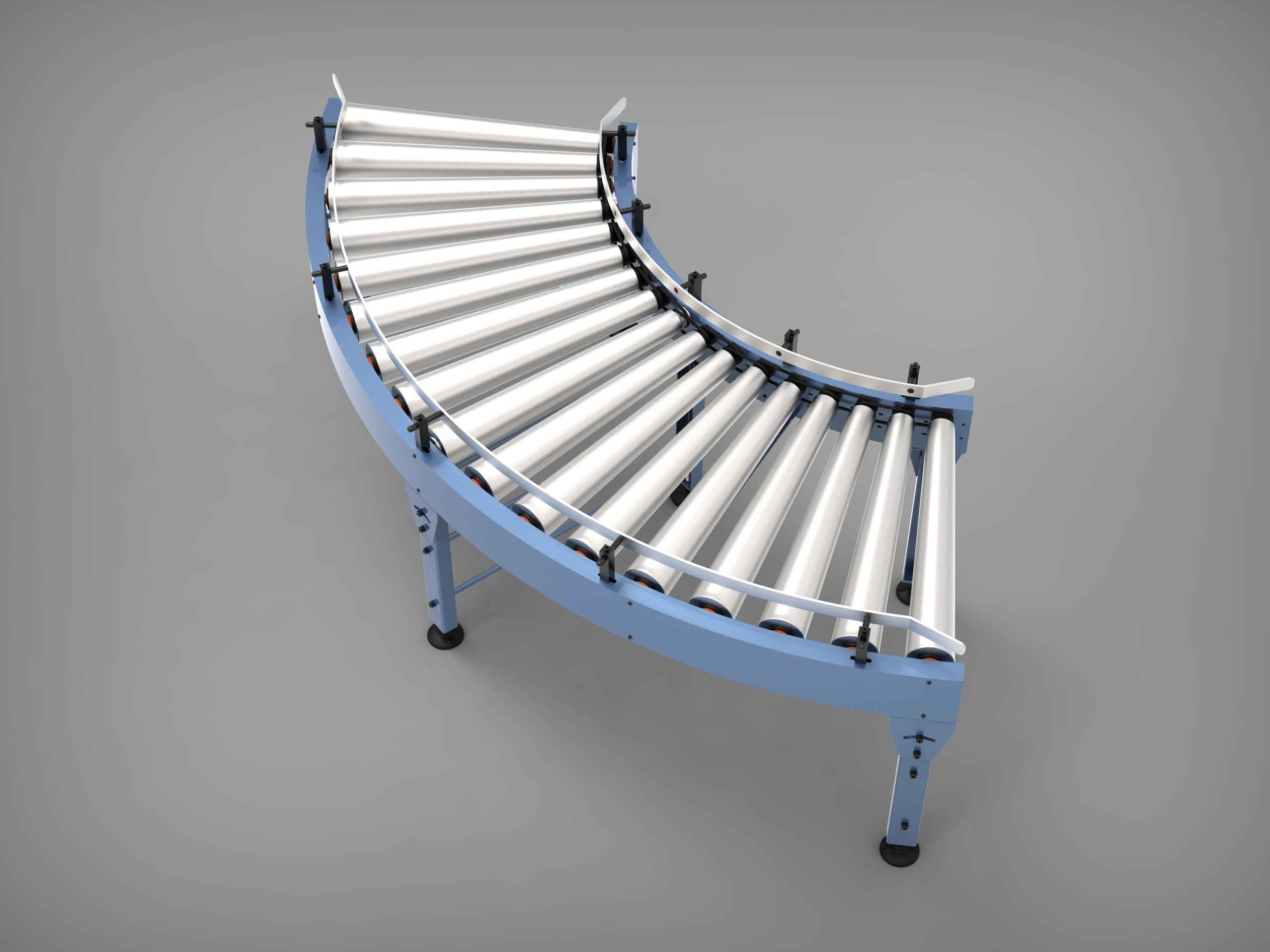 Con lăn côn/Con lăn hình nón (Tapered Rollers): Đây là đặc điểm nổi bật nhất. Các con lăn ở đoạn cong được thiết kế thuôn nhỏ ở phía bên trong đường cong và lớn hơn ở phía bên ngoài. Điều này đảm bảo rằng các vật phẩm (như hộp, thùng) di chuyển mượt mà và duy trì vị trí của chúng ngay cả khi đang chuyển hướng.