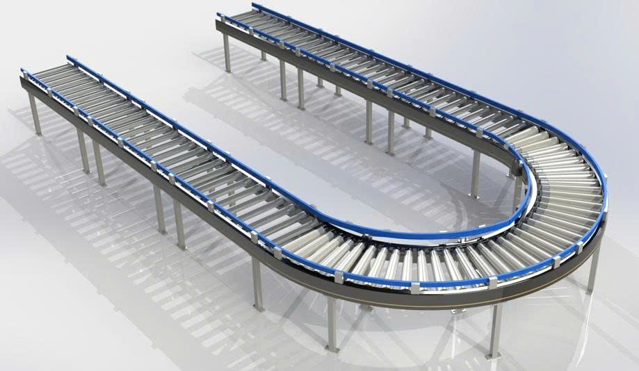 "Dây chuyền Băng tải Con lăn hoặc Hệ thống Băng tải Con lăn. Cụm từ này ám chỉ một chuỗi các đoạn băng tải con lăn được kết nối lại với nhau để tạo thành một tuyến đường vận chuyển dài.
